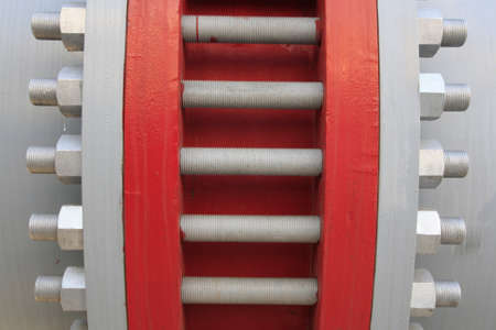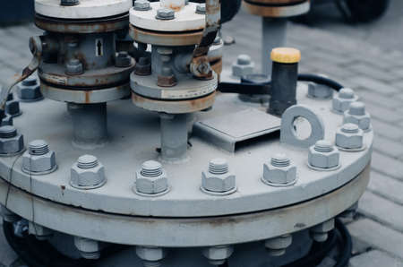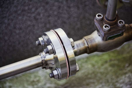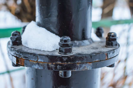 Part of the gas pipeline close-up. High pressure pipe flange connection. Industrial background for the supplier of equipment for gasification.