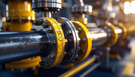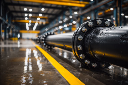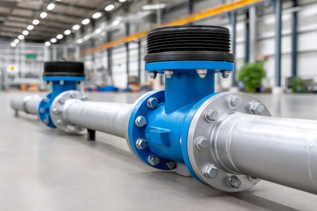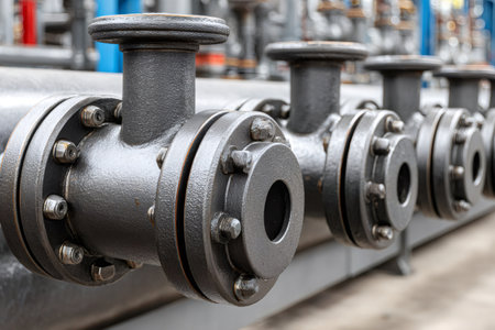 A large industrial pipe with multiple flanges and bolts in a factory setting
