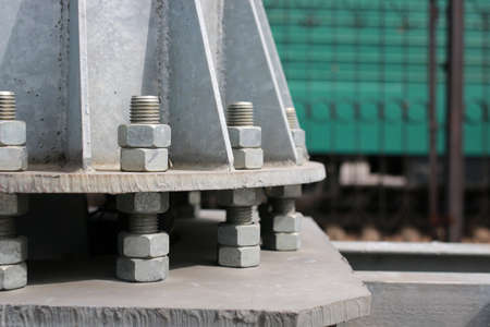 Industrial power transmission tower close-up. Metal structure reinforced with large bolts.
