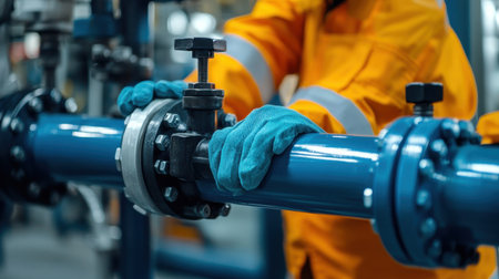 A dedicated worker in an orange safety uniform adjusts a valve on a blue industrial pipe, showcasing meticulous maintenance in a factory setting.