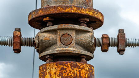 This close-up image showcases a rusty industrial pipe connector featuring corroded metal and aged bolts against a dramatic cloudy sky backdrop.