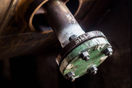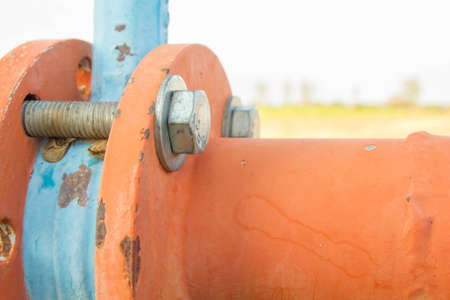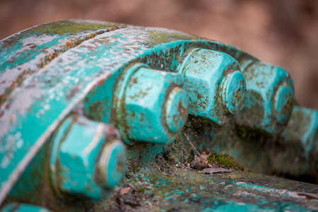 Selective extremely shallow focus close up of big nuts and bolts covered in layers of rust and old paint. Partial colorful view of round water supply pipe connection section. Natural daytime light