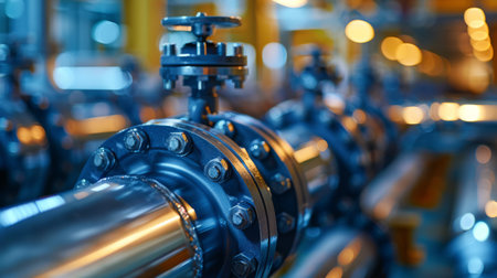 Metal pipelines with valves are connecting in a modern factory, showcasing industrial manufacturing processes