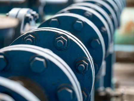 Bolts and nuts connection joint of blue stainless steel pipe and tube in factory. (Selective focus)