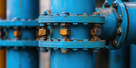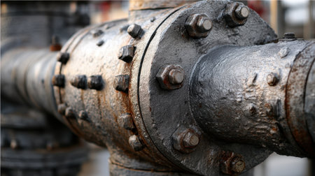 Close-up of corroded pipes and flanges in an industrial refinery, highlighting the effects of time and wear on metal infrastructure