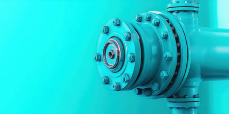 Close-up of a large pipeline fitting showcasing a vibrant turquoise color and metal bolts, emphasizing the precision and design of industrial machinery in a stylish environment.