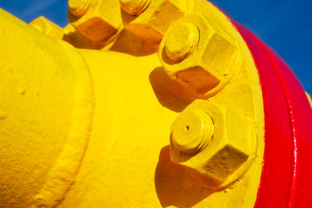 Metal pipe connection unit is painted with bright yellow and red paint. All-weather wear-resistant paint for metal parts. Background.