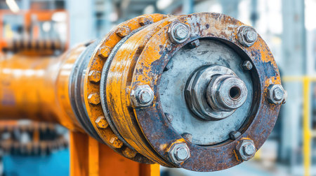 Close-up view of a robust metal pipe flange showcasing rust and bolts inside an industrial facility, highlighting the intricate details of manufacturing and engineering.