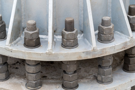 Joint of two flanges by bolts and nuts, selective focus only on first bolt