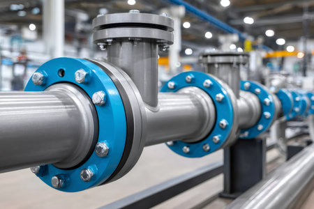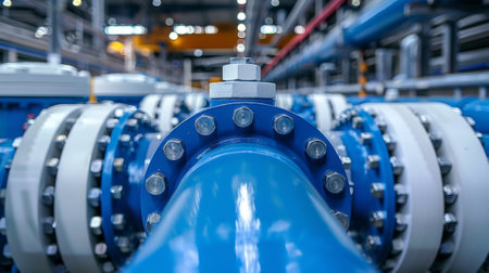 Shiny metal pipes connected with blue flanges and bolts form an industrial plumbing system