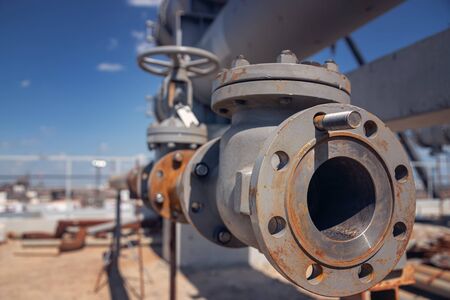 Pipes and valves at oil refinery plant. Industrial background. Selective focus