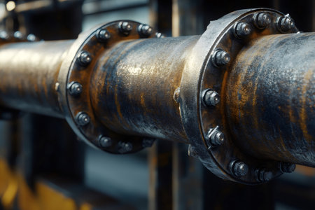 This image features a close-up view of a rusted metal pipe with visible bolts and an industrial texture, showcasing details of machinery and construction elements.