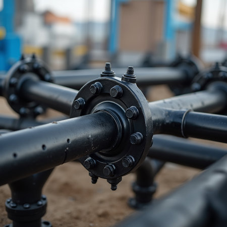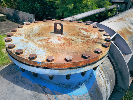 Large rusty pipes connected with flanges and bolts, showing signs of corrosion and wear, in an industrial setting