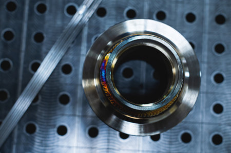 Freshly welded seam on a stainless flange. Production of metal products from stainless steel by welding