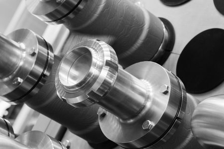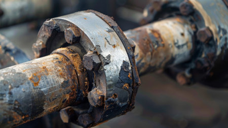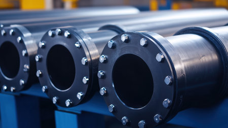 A close-up view of industrial pipes with flanges and nuts used in manufacturing settings for heavy equipment. Ideal for engineering and construction themes.