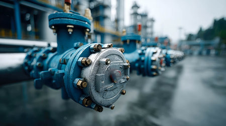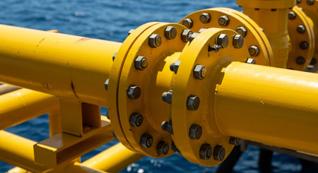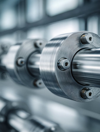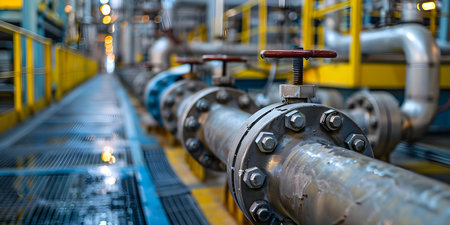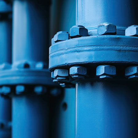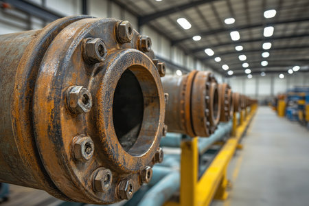 Shiny industrial pipeline system with large bolts connecting pipes in a factory