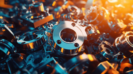 High Precision Metal Industrial Machinery Parts with Flange Patterns on a Blue Tinted Factory Background AI Generative