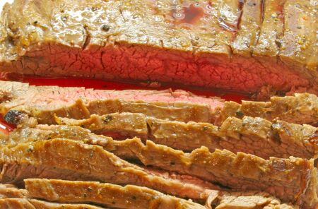 A nice cut of flank steak roasted rare and sliced