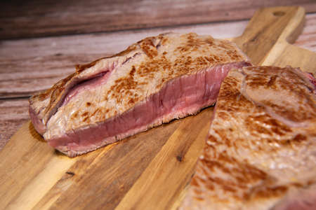 Freshly sliced sirloin meat on the wooden table