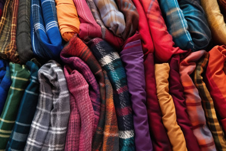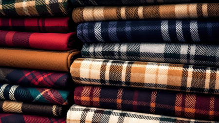 plaid scarves in different hues and patterns spread on the floor, created with generative ai