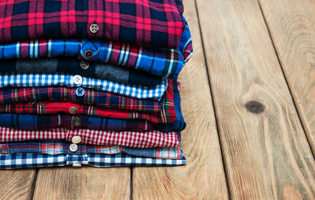 Three multi-colored checkered women's shirts lying neatly folded on a light wooden background