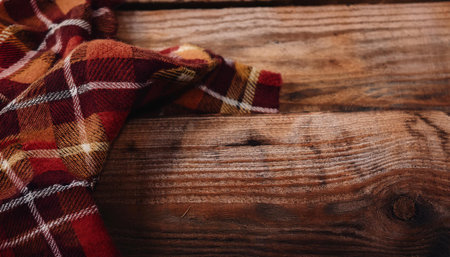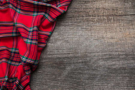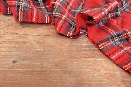 Traditional Scottish Red Tartan Woolen Soft and Worm Scarf on Grunge Timber Board. Background with Free Space.
