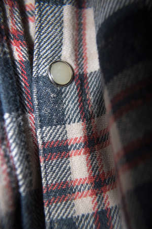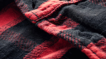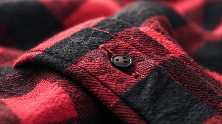 This close-up image showcases a red and black checkered flannel fabric featuring a distinct button detail. Ideal for fashion, craftsmanship, and textiles.