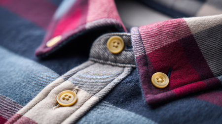 A close-up image displays a colorful flannel shirt collar featuring distinctive buttons and a textured fabric, ideal for showcasing casual fashion and style trends.