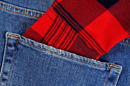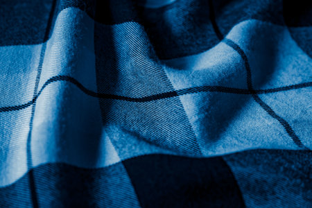 Photo of a pattern of checkered Scottish fabric with jeans for creating a background, pattern, textiles, printed matter