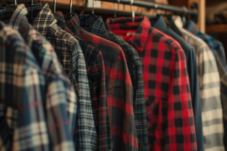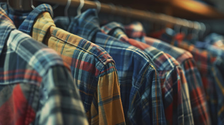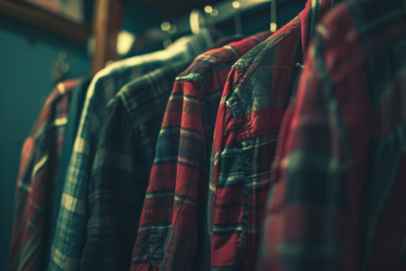 Plaid flannel shirts hanging on a clothing rack in a store or closet, warm lighting and soft focus create a cozy, rustic feel.