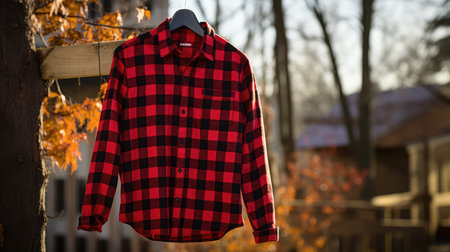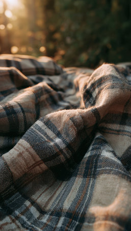 A detailed close-up of plaid flannel fabric, illuminated by gentle sunlight filtering through a forest, creating a cozy autumn atmosphere with a minimal aesthetic.