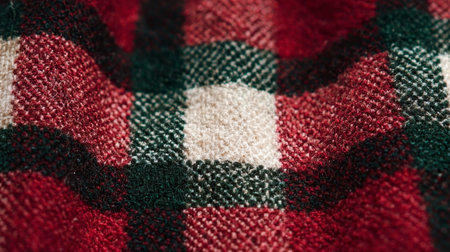Close-Up of Red and Green Woven Plaid Fabric with Intricate Macro Texture and Checks Design Pattern