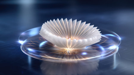 A stunning 3D representation of a shell-like object on a glossy surface, illuminated by soft light effects, showcasing modern art and innovation.