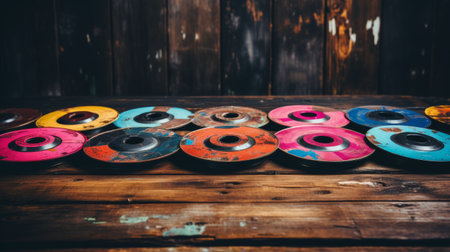 A group of vibrant, circular discs are arranged neatly on top of a rustic wooden table, creating a visually appealing display.
