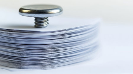 A close-up perspective of a metal paper clip attached to a stack of documents, showcasing a minimalistic and professional office ambiance, perfect for business themes.