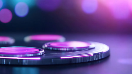 A close-up shot of a futuristic design with neon lights and circular platforms, creating a vibrant and modern aesthetic.