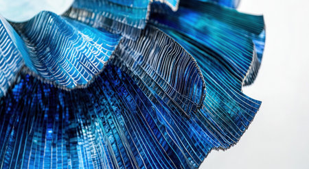 A close-up of an abstract fan-shaped structure made from blue metallic lines, set against a clean white background. The texture and color of the metal lines create depth in the space, with each line having its own unique pattern. This visual representation depicts digital data flowing through different layers or platforms within virtual worlds. --ar 11:6 --v 6.1 Job ID: bca2f252-20ee-48af-b9f9-dfa06123e36c