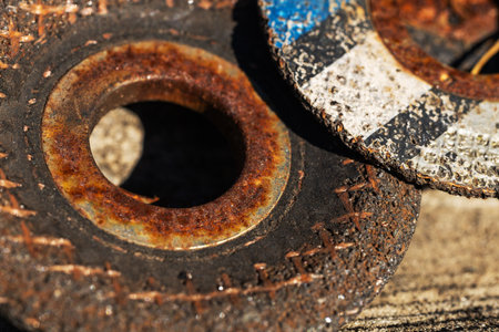 Old abrasive disks for metal and stone grinding, cutting - close up.