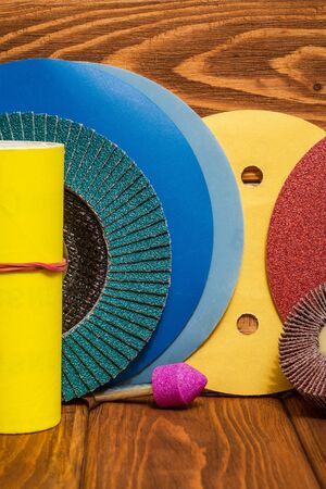 Big set of abrasive tools and multicolored sandpaper on wooden vintage background, wizard is used for grinding items