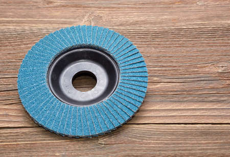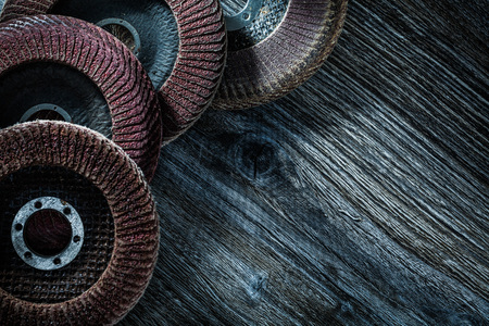 Angle grinder rotary grinding discs on vintage wooden board.