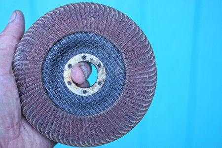 hand holds one old round brown black grinding wheel on a blue background