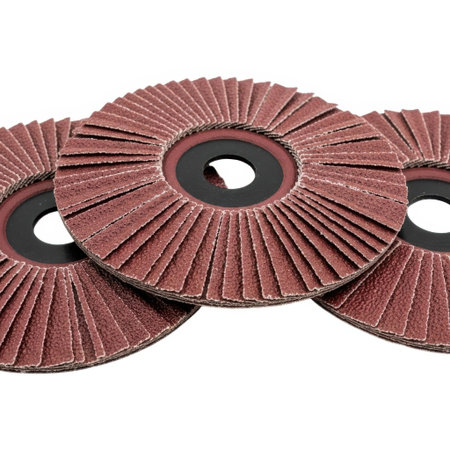 A detailed view of three abrasive flap discs, showcasing their folded abrasive material. These discs are essential tools for surface preparation, grinding, and polishing in various metalworking applications.