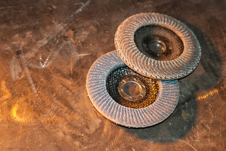 two abrasive flap discs on metalic background