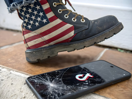 Mobile phone with broken screen and American flag on the wooden background.