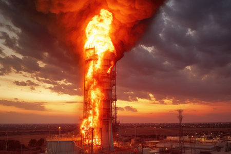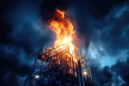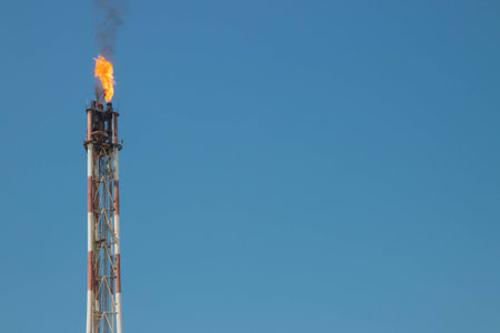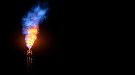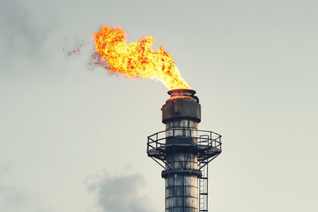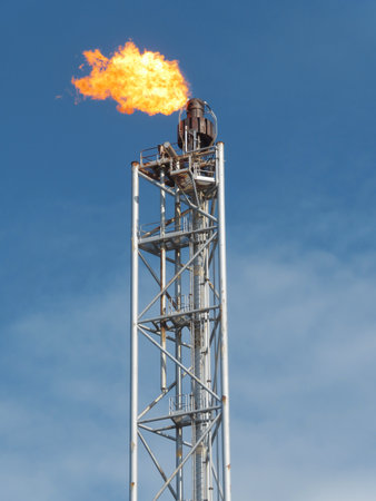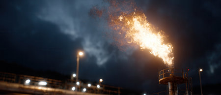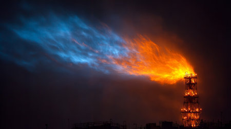 Fiery exhaust from a gas flare stack at an industrial plant, symbolizing energy production and environmental impact.