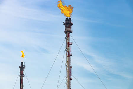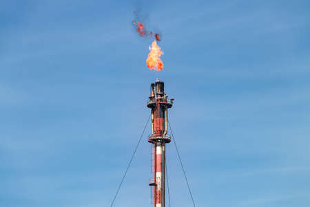 Oil and gas industry. Flames from the chimney of an oil rig.