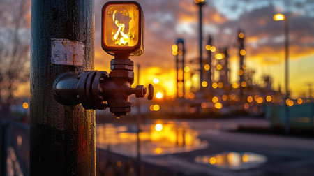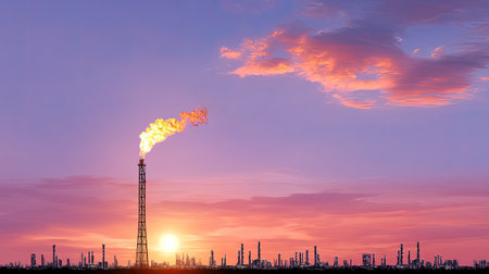 A dramatic image shows an industrial gas flare igniting amid a captivating sunset, with a blurred refinery in the background and warm hues illuminating the sky.