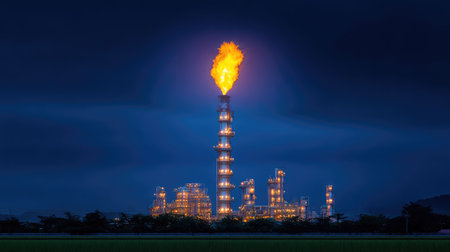 Stunning industrial scene showcasing a refinery illuminated at night with a dramatic flame emission, reflecting themes of energy, innovation, and manufacturing in urban landscapes.