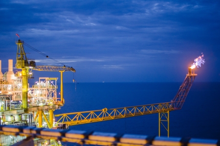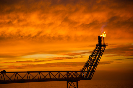 Gas flare burning on an offshore platform, emitting toxic gases and polluting the atmosphere at twilight