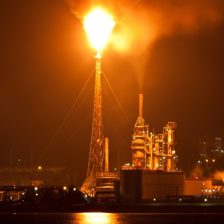 A towering flame erupts from an industrial structure against a dark sky. The dramatic fire highlights energy extraction and the impact of emissions in a nighttime scenario.